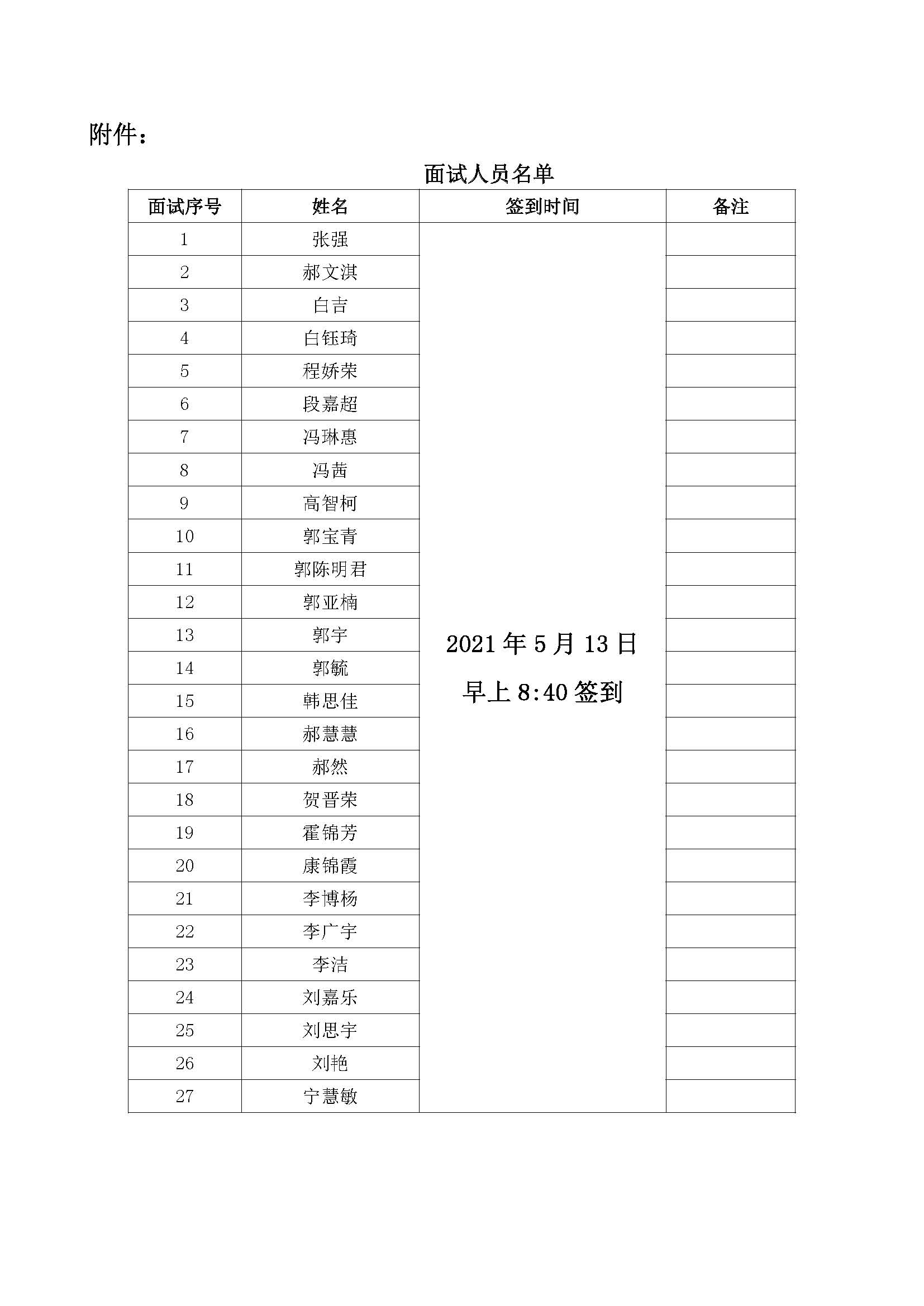 1、面試時(shí)間:2021年5月13日(周四)上午9:00。本次面試分為兩組,簽到時(shí)間不同,請(qǐng)各位考生自行查看附件表。