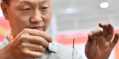 6月18日,山西省太原市,職業(yè)技能大賽選手用發(fā)絲穿鉛筆芯,展示“鉛筆芯上鉆微孔”成果。當(dāng)日,第五屆山西省職業(yè)技能大賽暨第三屆全國技能大賽山西選拔賽開賽。本屆大賽設(shè)46個(gè)賽項(xiàng),來自29支代...