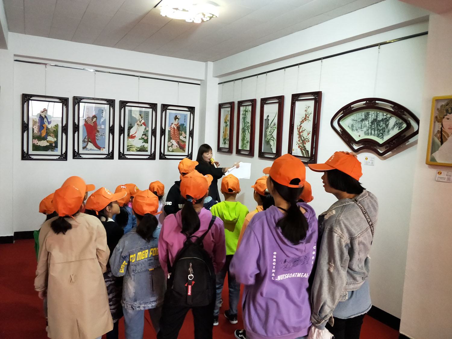 鄭氏砂藝講解員在為研學(xué)小朋友們講解砂畫作品《梅》、《蘭》、《竹》、《菊》的創(chuàng)作意義