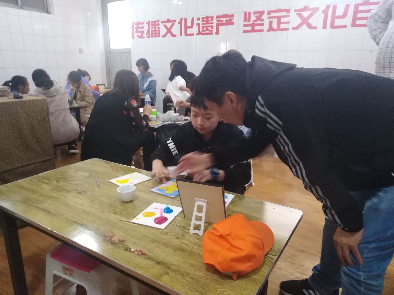 研學(xué)小朋友和家長(zhǎng)正在對(duì)砂畫點(diǎn)籃的顏色搭配進(jìn)行探討