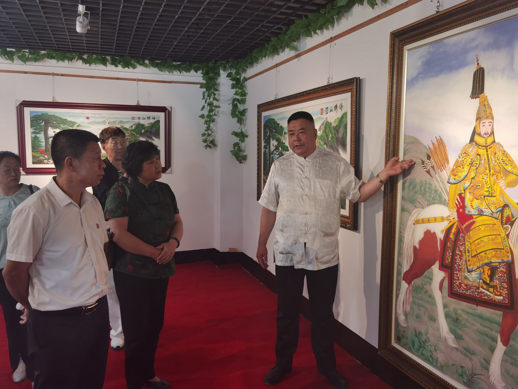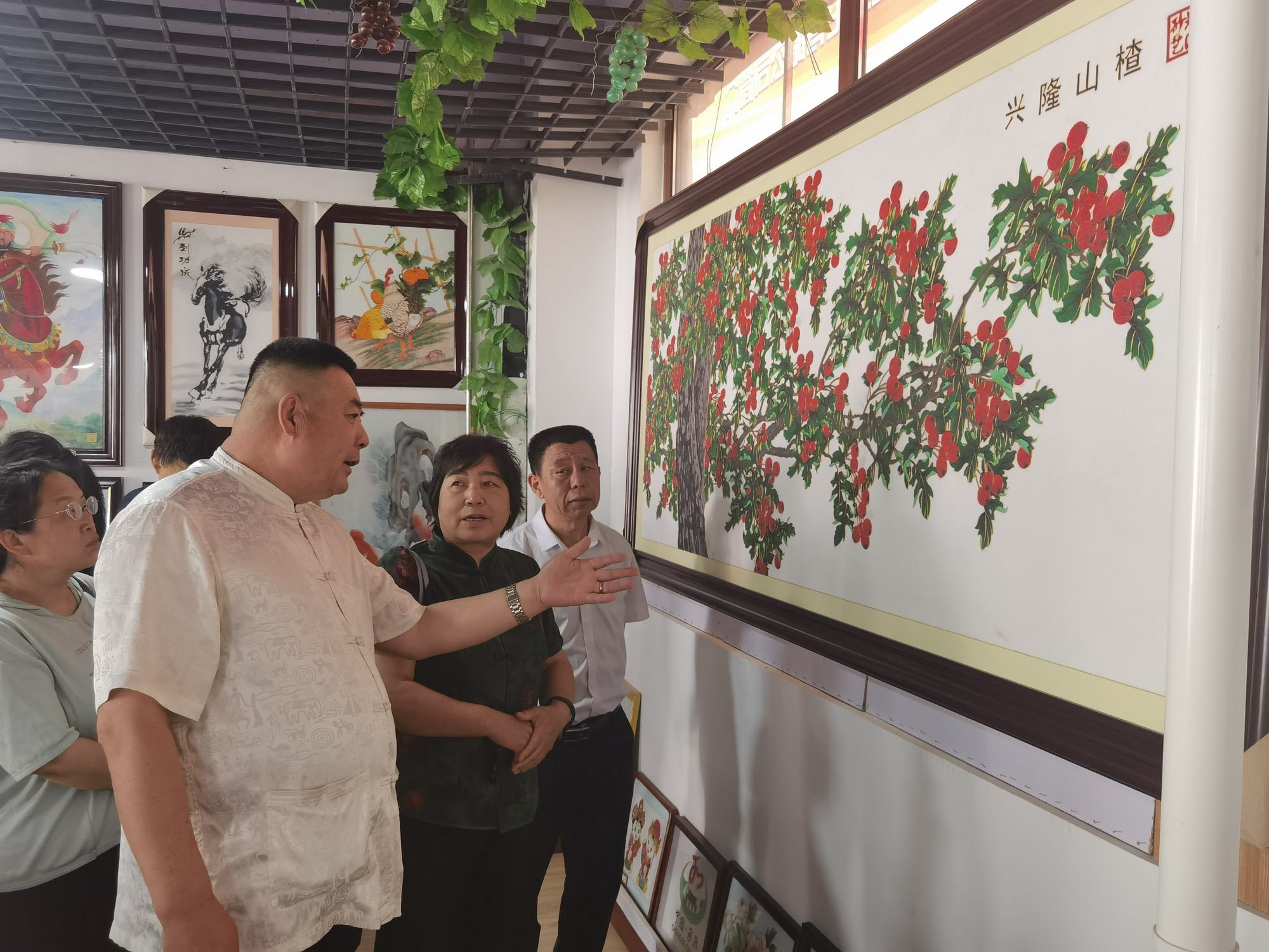 上午9時許,石俊鳳主席一行在鄭鐵軍主席的陪同下,參觀了鄭氏砂藝(畫)非遺博物館。博物館展出了鄭氏砂藝多年來在傳承和發(fā)展中的非遺砂畫精品3000余幅,這些作品能清晰地反映出鄭氏砂藝在不同時期的技術(shù)特點,同時也展現(xiàn)了鄭氏砂藝在非遺技藝和材料運用的不斷提升。參觀過程中,鄭鐵軍主席如數(shù)家珍般地向大家介紹了館內(nèi)藏品,這些作品有的被各大博物館收藏,有的被其他國家作為國禮收藏,有的獲得了國家級獎項等等。參觀結(jié)束后,石俊鳳主席表示:“鄭氏砂藝這些年的發(fā)展是有目共睹的,是承德市文化企業(yè)中發(fā)展較快、規(guī)模較大的,鄭氏砂藝的發(fā)展經(jīng)驗是值得我們學習和借鑒的,祝愿鄭氏砂藝在今后的發(fā)展中更上一層樓。同時鄭氏砂藝(畫)技藝是一項技術(shù)要求較高且畫面精美的非遺藝術(shù),非常值得大家學習和交流,增加大家對鄭氏砂藝非遺文化的了解”。