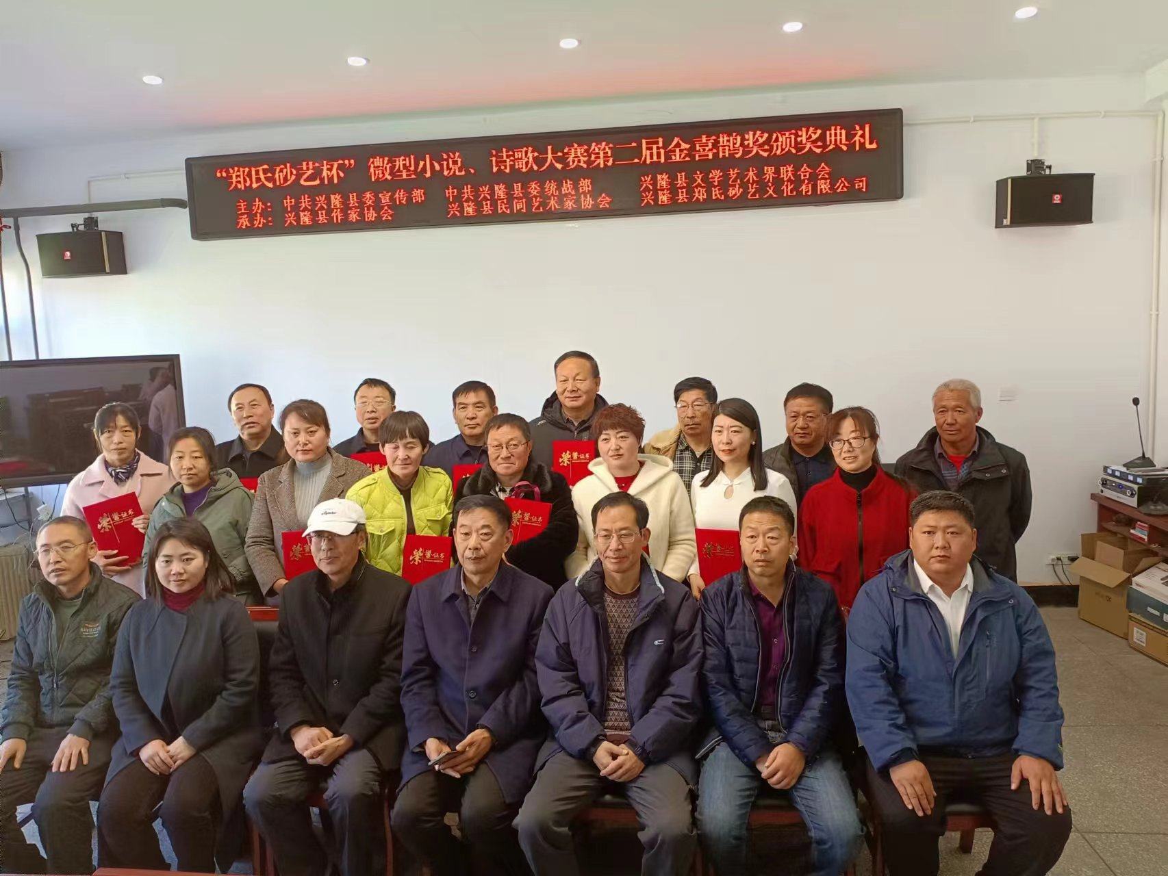 2023年11月9日上午,在興隆縣鄭氏砂藝文化有限公司舉辦了由中共興隆縣委宣傳部、中共興隆縣委統(tǒng)戰(zhàn)部、興隆縣文學(xué)藝術(shù)界聯(lián)合會(huì)主辦,興隆縣作協(xié)、興隆縣民間藝術(shù)家協(xié)會(huì)和興隆縣鄭氏砂藝文化有限公司承辦的“鄭氏砂藝杯”微型小說(shuō)、詩(shī)歌大賽第二屆金喜鵲獎(jiǎng)?lì)C獎(jiǎng)典禮,出席此次頒獎(jiǎng)典禮的主要領(lǐng)導(dǎo)有承德市作家協(xié)會(huì)主席王琦,承德市文聯(lián)二級(jí)調(diào)研員閆春生,興隆縣委宣傳部副部長(zhǎng)、文明辦主任溫偉,興隆縣委統(tǒng)戰(zhàn)部常務(wù)副部長(zhǎng)楊榮寶,興隆縣作協(xié)主席王金石,興隆縣鄭氏砂藝文化有限公司董事長(zhǎng)、縣民協(xié)主席鄭鐵軍及“鄭氏砂藝杯”微型小說(shuō)、詩(shī)歌大賽獲獎(jiǎng)人員,典禮由興隆縣文學(xué)藝術(shù)界聯(lián)合會(huì)主席賈永主持。