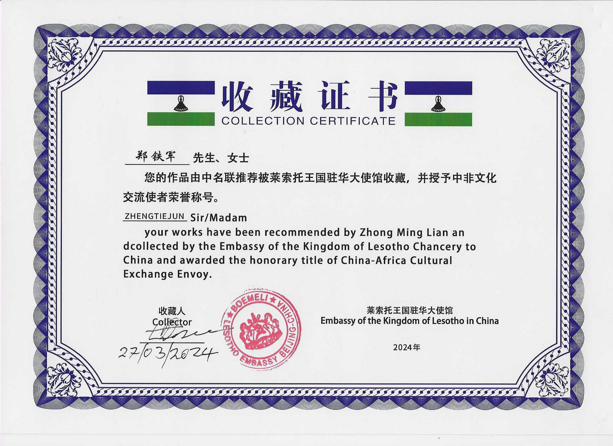 萊索托王國駐華大使邀請(qǐng)中名聯(lián)國際趙萍女士推薦的中名聯(lián)簽約國禮藝術(shù)家鄭鐵軍,于2024年3月26日至27日上午前往萊索托王國駐華大使館進(jìn)行中萊文化交流。萊索托駐華外交官杜麥羅.莫塞邁公使銜參贊對(duì)趙萍女士和鄭鐵軍先生的到來表示熱烈歡迎。在萊索托王國駐華使館會(huì)客廳中,鄭鐵軍向杜麥羅.莫塞邁介紹了鄭氏砂藝(畫)藝術(shù)特點(diǎn)和文化內(nèi)涵,萊索托王國外交官對(duì)鄭鐵軍的作品給予高度評(píng)價(jià),對(duì)傳統(tǒng)文化藝術(shù)鄭氏砂藝(畫)所蘊(yùn)含的深厚中華文化底蘊(yùn)極其贊賞,現(xiàn)場(chǎng)將鄭鐵軍的作品《國色天香》作為國禮永久收藏。杜麥羅.莫塞邁公使銜參贊表示非常榮幸,愿意將更多的鄭氏砂藝(畫)作品贈(zèng)送全球友華政要,成為中國文化國際傳播橋梁,隨后,親筆簽名收藏證書,并授予鄭鐵軍中非文化交流使者榮譽(yù)稱號(hào)。