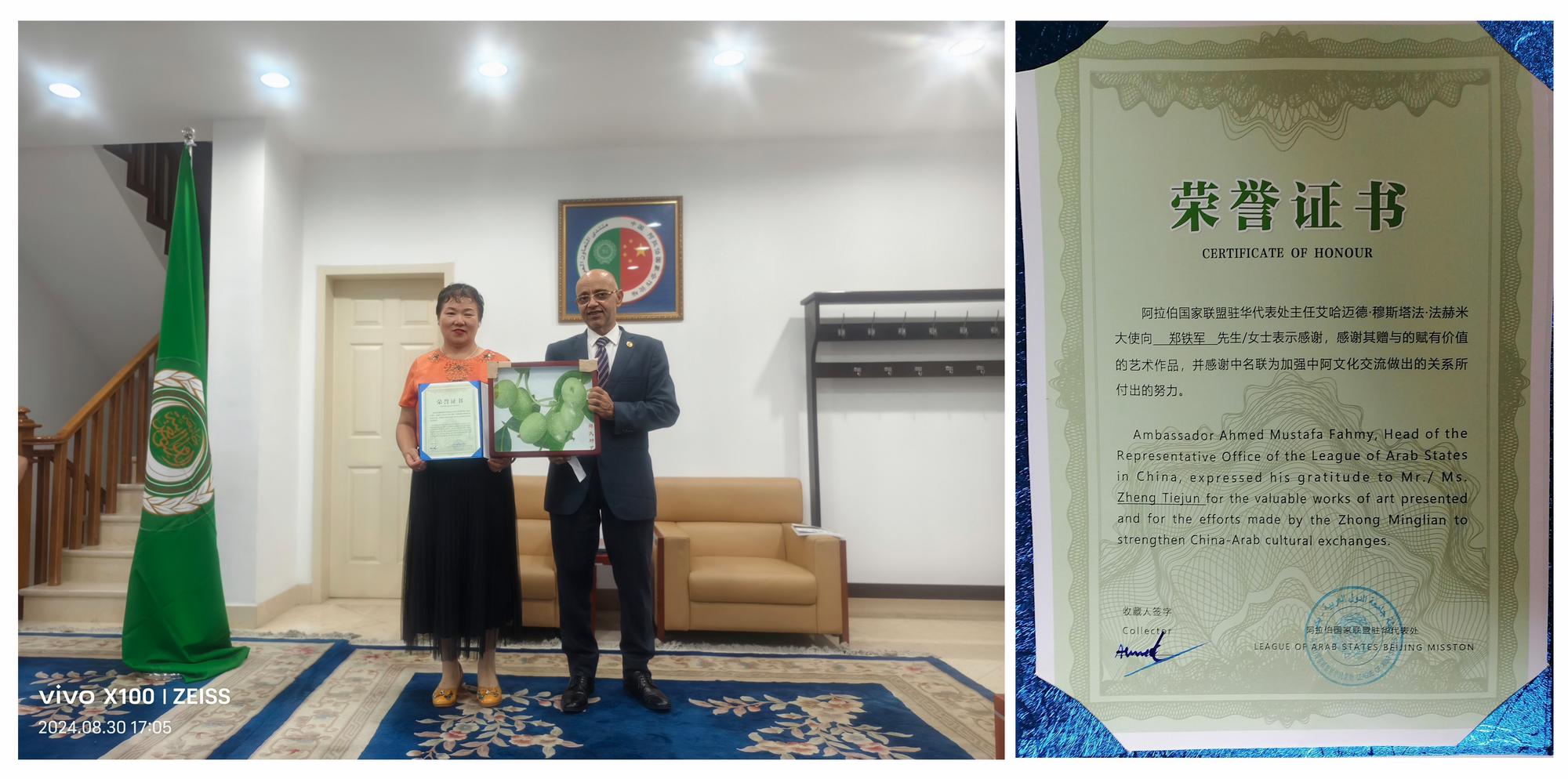 2025年1月16日,應(yīng)阿拉伯國家聯(lián)盟代表處主任艾哈邁德·穆斯塔法·法赫米大使的盛情邀請,鄭氏砂藝形象代言人劉秀華攜中名聯(lián)簽約國禮藝術(shù)家鄭鐵軍的精美作品,參加在大使館舉辦的中阿文化交流活動,并代表興隆文化鄭氏砂藝進行了藝術(shù)品捐贈與收藏儀式。